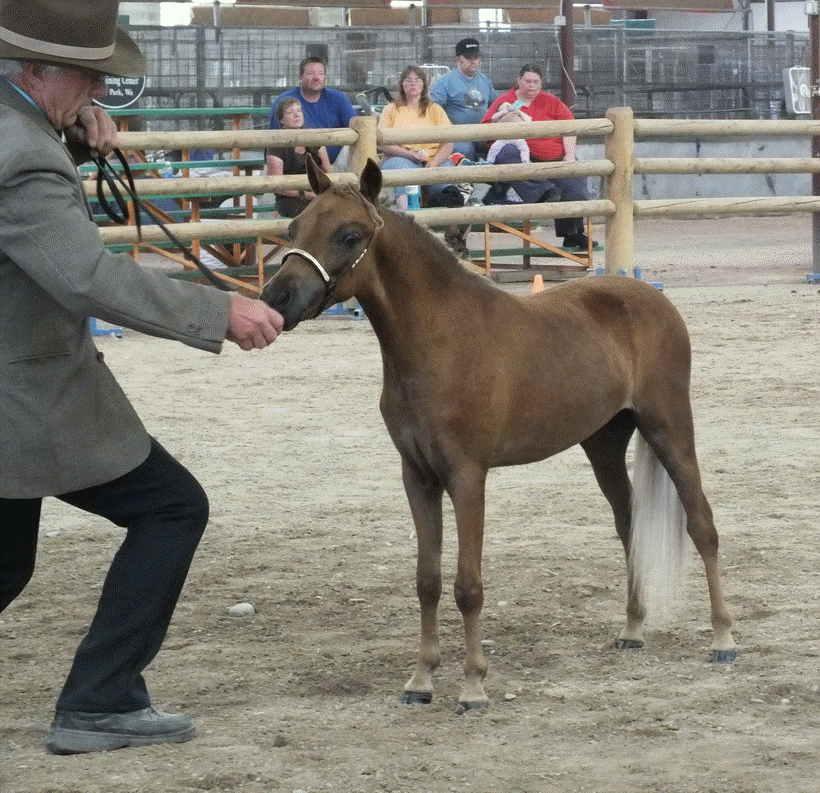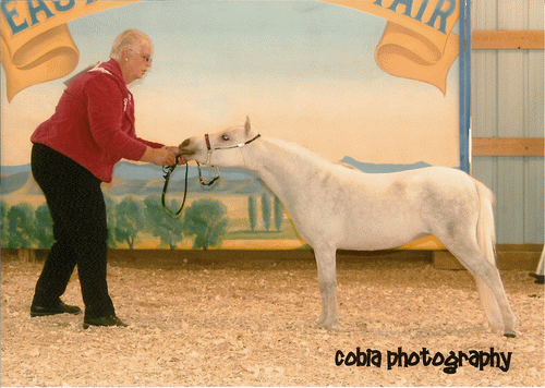 I have started training Thunder. He was not handled much as a foal. He is learning to trust me. He is showing me that he has a good head for learning. He seems not to be afraid of anything. He still has to let the mares knows that he is coming to the backyard. I really like his trot. He has very good movements. He should drive real nice and be real showy. He still has a lot of growing up to do. Here is picture of him at his first show. He did real well and learned a lot. I want to thank Alan and Dennis for showing him at the Snake River Miniature Horse Show. He did very well considering it was his first show. He got 2 Reserve Champions.