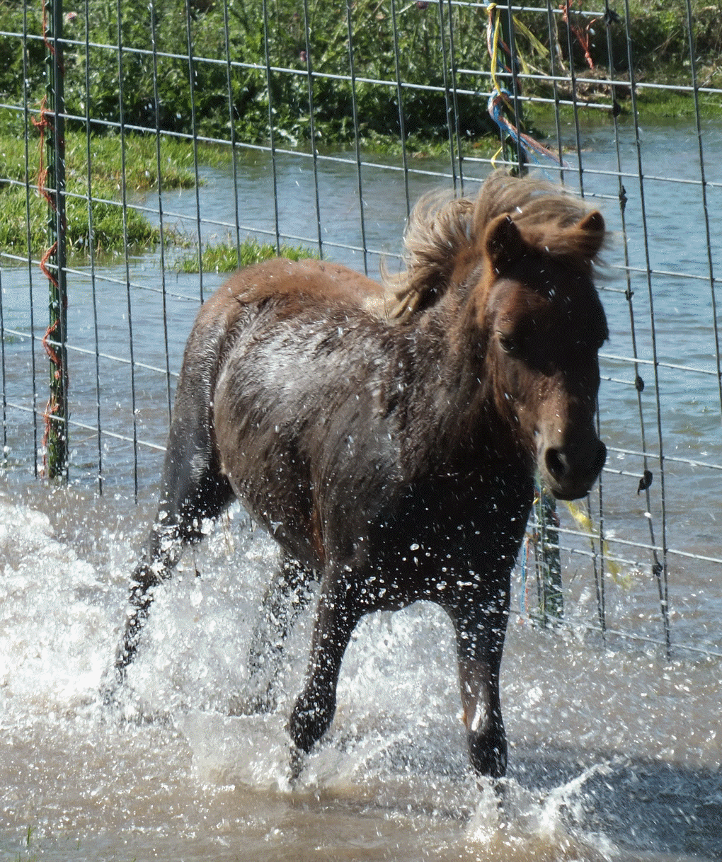 He really loves to play. Here is picture of him playing in the water. He makes me laugh all the time. He watches me when I come out of the house. He comes running to me. He sure has changed since I got him. He is very easy to work with. He love to play in the water. We have 1 foal by him this year. He is very nice we have decided to keep him and train him to be performance gelding. I'm sure he will exceed in this. His Name is Tiny Acres Thunders Rocky. You can see pictures of him on the gelding page.